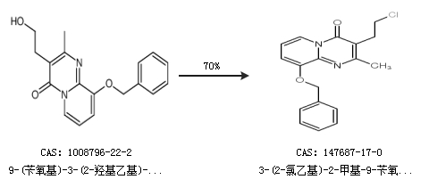 2.通過9-(芐氧基)-3-(2-羥基乙基)-2-甲基-4H-吡啶并[1,2-a]嘧啶-4-酮合成3-(2-氯乙基)-2-甲基-9-芐氧基-4H-吡啶并[1,2A]嘧啶-4酮 (帕潘立酮),收率約70%;