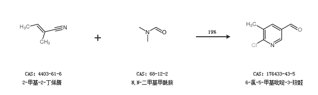 1.通過2-甲基-2-丁烯腈和N,N-二甲基甲酰胺合成6-氯-5-甲基吡啶-3-羧醛,收率約19%;