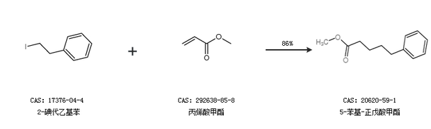 2.通過2-碘代乙基苯和丙烯酸甲酯合成5-苯基-正戊酸甲酯,收率約86%;