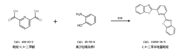 1.通過吡啶-2,6-二甲酸和美沙拉嗪雜質C合成2,6-二苯并唑基吡啶,收率約83%;