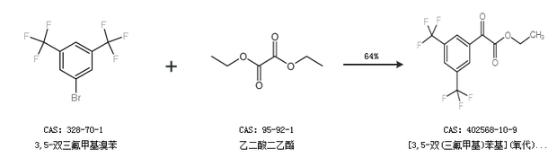 1.通過3,5-雙三氟甲基溴苯和乙二酸二乙酯合成[3,5-雙(三氟甲基)苯基](氧代)乙酸乙酯,收率約64%;