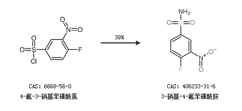 1.通過4-氟-3-硝基苯磺酰氯合成3-硝基-4-氟苯磺酰胺,收率約39%;