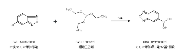 2.通過5-溴-2,1,3-苯并惡唑和硼酸三乙酯合成2,1,3-苯并噁二唑-5-基-硼酸,收率約34%;