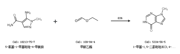 1.通過5-氨基-1-甲基吡唑-4-甲酰胺和甲酸乙酯合成1-甲基-1,5-二氫吡唑并[3,4-D]嘧啶-4-酮,收率約83%;