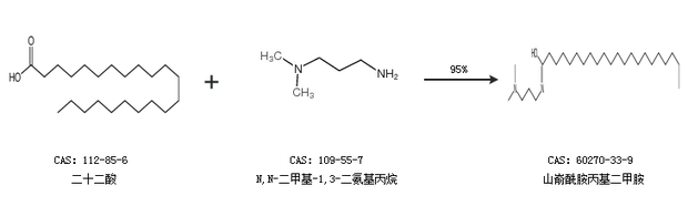1.通過二十二酸和N,N-二甲基-1,3-二氨基丙烷合成山崳酰胺丙基二甲胺,收率約95%;