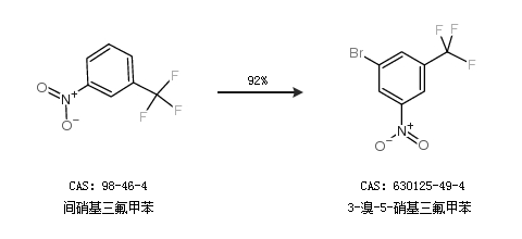 1.通過(guò)間硝基三氟甲苯合成3-溴-5-硝基三氟甲苯,收率約92%;