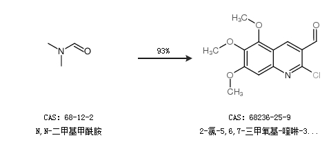 1.通過N,N-二甲基甲酰胺合成2-氯-5,6,7-三甲氧基-喹啉-3-甲醛,收率約93%;