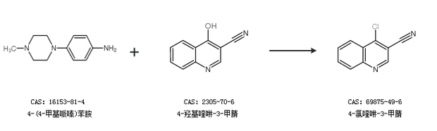 2.通過4-(4-甲基哌嗪)苯胺和4-羥基喹啉-3-甲腈合成4-氯喹啉-3-甲腈