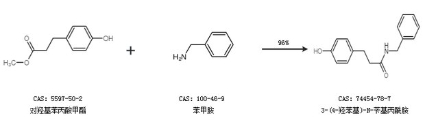 1.通過對羥基苯丙酸甲酯和苯甲胺合成3-(4-羥苯基)-N-芐基丙酰胺,收率約96%;