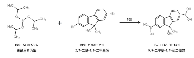 2.通過硼酸三異丙酯和2,7-二溴-9,9-二甲基芴合成9,9-二甲基-2,7-芴二硼酸,收率約70%;