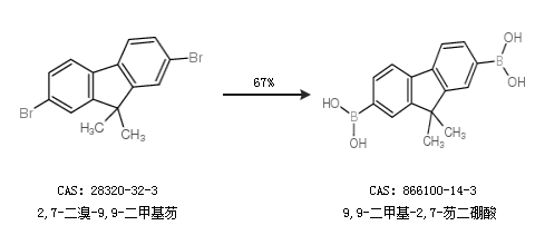 1.通過2,7-二溴-9,9-二甲基芴合成9,9-二甲基-2,7-芴二硼酸,收率約67%;