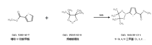 1.通過噻吩-2-羧酸甲酯和頻哪醇硼烷合成5-(4,4,5-三甲基-[1,3,2]二氧硼戊環(huán)-2-基)-噻吩-2-甲酸甲酯,收率約94%;