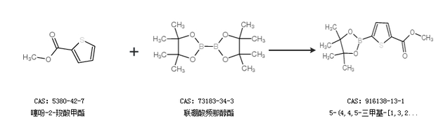 2.通過噻吩-2-羧酸甲酯和聯(lián)硼酸頻那醇酯合成5-(4,4,5-三甲基-[1,3,2]二氧硼戊環(huán)-2-基)-噻吩-2-甲酸甲酯