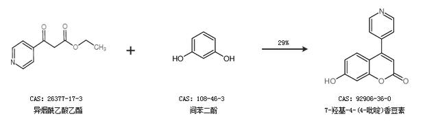 1.通過異煙酰乙酸乙酯和間苯二酚合成7-羥基-4-(4-吡啶)香豆素,收率約29%;