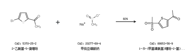 1.通過2-乙?;?5-溴噻吩和甲烷亞磺酸鈉合成1-(5-(甲基磺?;?噻吩-2-基)乙酮,收率約82%;