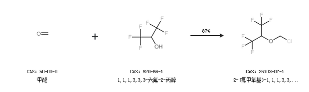 2.通過甲醛和1,1,1,3,3,3-六氟-2-丙醇合成2-(氯甲氧基)-1,1,1,3,3,3-六氟丙烷,收率約87%;