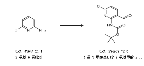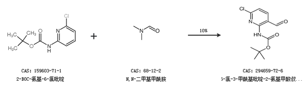 1.通過2-BOC-氨基-6-氯吡啶和N,N-二甲基甲酰胺合成6-氯-3-甲酰基吡啶-2-氨基甲酸叔丁酯,收率約10%;