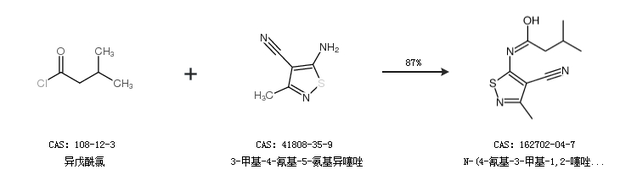 1.通過異戊酰氯和3-甲基-4-氰基-5-氨基異噻唑合成N-(4-氰基-3-甲基-1,2-噻唑-5-基)-3-甲基丁酰胺,收率約87%;