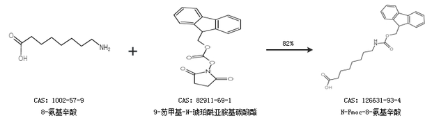 1.通過8-氨基辛酸和9-芴甲基-N-琥珀酰亞胺基碳酸酯合成N-Fmoc-8-氨基辛酸,收率約82%;