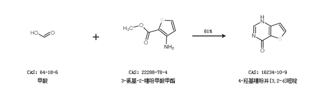2.通過(guò)甲酸和3-氨基-2-噻吩甲酸甲酯合成4-羥基噻吩并[3,2-d]嘧啶,收率約81%;